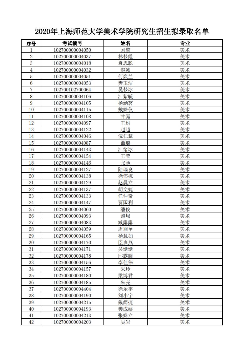 上海師范大學(xué)美術(shù)學(xué)院2020年考研錄取名單公示 發(fā)布時(shí)間:2020-05-19 上海師范大學(xué)美術(shù)學(xué)院2020年考研錄取名單公示 上一篇:上海師范大學(xué)美術(shù)學(xué)院2020年考研復(fù)試分?jǐn)?shù)線公布 下一篇:上海師范大學(xué)美術(shù)學(xué)院2021年考研招生目錄及參考書(shū)目
