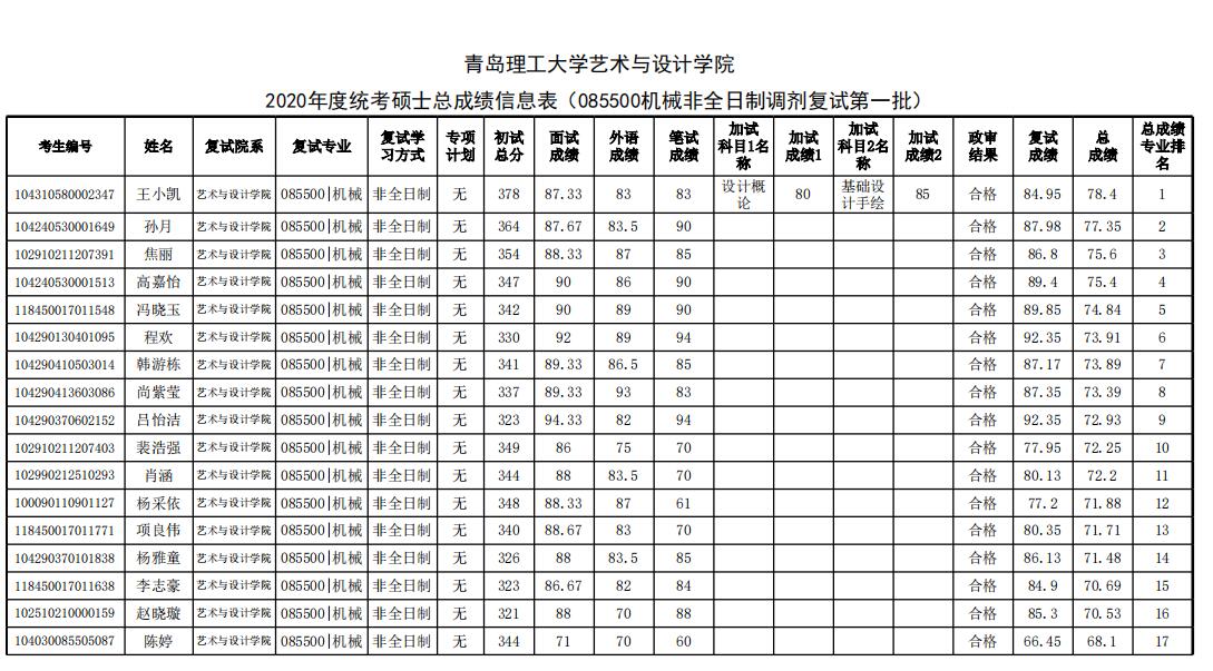 青島理工大學(xué)藝術(shù)設(shè)計(jì)學(xué)院2020年考研調(diào)劑復(fù)試成績(jī)公示 發(fā)布時(shí)間:2020-05-27 青島理工大學(xué)藝術(shù)設(shè)計(jì)學(xué)院2020年考研調(diào)劑復(fù)試成績(jī)公示 上一篇:青島理工大學(xué)藝術(shù)設(shè)計(jì)學(xué)院2020年考研復(fù)試成績(jī)公示 下一篇:青島理工大學(xué)2020年考研一志愿擬錄取名單