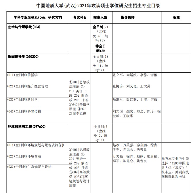 中國地質(zhì)大學(xué)(武漢)藝術(shù)與傳媒學(xué)院2021年考研招生目錄 發(fā)布時間:2020-08-24 中國地質(zhì)大學(xué)(武漢)藝術(shù)與傳媒學(xué)院2021年考研招生目錄 上一篇:中國地質(zhì)大學(xué)(武漢)珠寶學(xué)院2021年考研招生目錄 下一篇:中國地質(zhì)大學(xué)2021年考研初試成績查詢時間2月27日公布