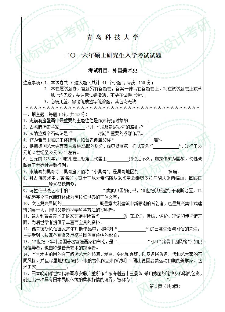 青島科技大學藝術學院2016年考研真題:876外國美術史 發(fā)布時間:2019-09-01 上一篇:青島科技大學藝術學院2020年考研錄取名單公示 下一篇:青島科技大學藝術學院2017年考研真題:876外國美術史