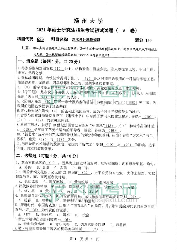揚(yáng)州大學(xué)美術(shù)與設(shè)計(jì)學(xué)院2021年藝術(shù)設(shè)計(jì)考研真題:653藝術(shù)設(shè)計(jì)基礎(chǔ)知識(shí)