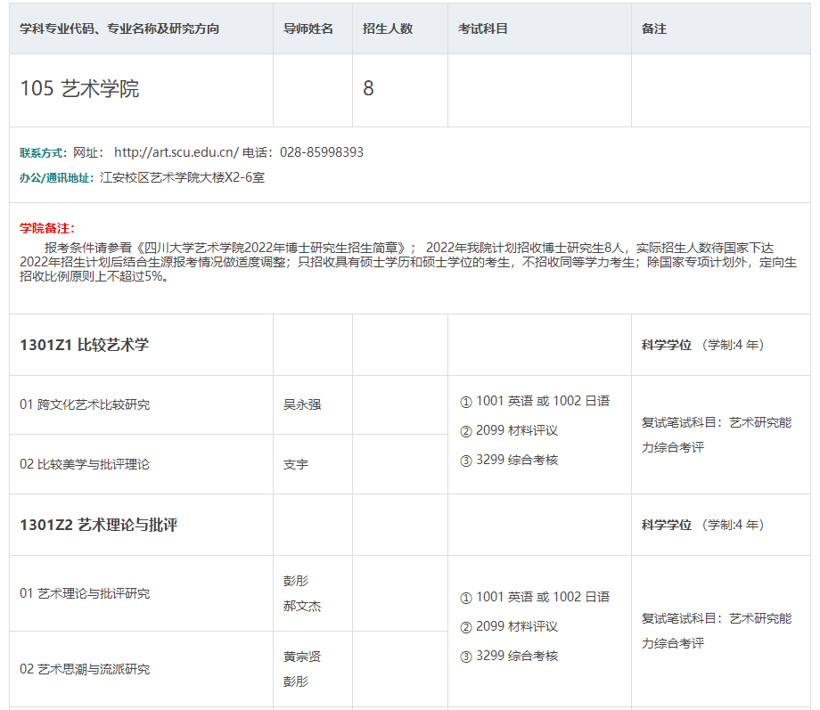 四川大學藝術學院2022年博士研究生招生目錄 發(fā)布時間:2021-11-16 四川大學藝術學院2022年博士研究生招生目錄 上一篇:四川大學2022年考研初試成績查詢時間公布 下一篇:四川大學藝術學院2022年普通招考博士研究生招生簡章