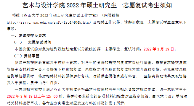 藝術(shù)與設(shè)計學(xué)院2022年考研碩士研究生一志愿復(fù)試考生須知 發(fā)布時間:2022-03-17 藝術(shù)與設(shè)計學(xué)院2022年考研碩士研究生一志愿復(fù)試考生須知 上一篇:燕山大學(xué)2022年考研復(fù)試工作方案 下一篇:燕山大學(xué)2022年考研一志愿復(fù)試名單公布