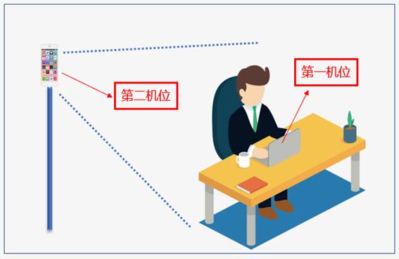 3. 考生根據(jù)工作人員要求進(jìn)行視頻角度及清晰度調(diào)整。兩套設(shè)備中,第一套設(shè)備為主設(shè)備,要求放置在考生座位正前方,視頻監(jiān)控范圍應(yīng)保證考生在坐姿狀態(tài)下能夠完整清晰覆蓋頭部到桌面位置,用于系統(tǒng)進(jìn)行人臉識(shí)別、身份驗(yàn)證等;另一套為輔助設(shè)備,放置于考生右后方45度位置,確保監(jiān)控范圍覆蓋第一臺(tái)設(shè)備的顯示屏幕和考生本人頭部、背部、手部。