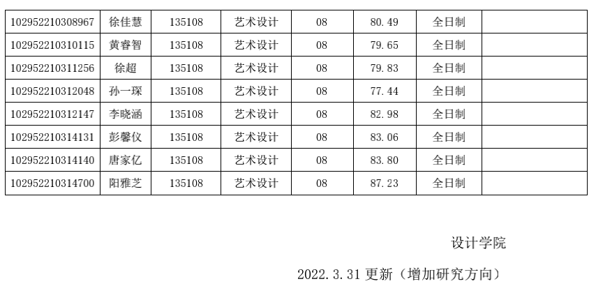 江南大學設計學院2022年考研擬錄取名單公示 發(fā)布時間:2022-03-30 根據(jù)考生復試情況及綜合成績排名,現(xiàn)公布我院建議錄取名單,名單可能因?qū)W校下達招生名額等情況發(fā)生變更,請及時關注。實際錄取名單以學校研究生招生工作領導小組審核通過、研究生院公示擬錄取名單無異議、教育部最終審定為準。 上一篇:江南大學設計學院2022年考研復試日程安排 下一篇:江南大學2023年工業(yè)設計考研真題(回憶版):設計學、藝術(shù)設計