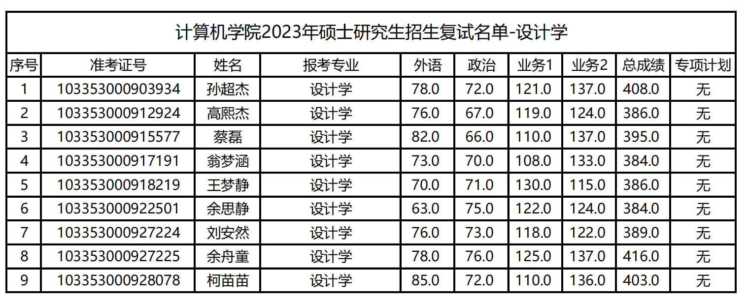 浙江大學(xué)計算機學(xué)院2023年工業(yè)設(shè)計考研復(fù)試名單公布 發(fā)布時間:2023-03-18 浙江大學(xué)計算機學(xué)院2023年工業(yè)設(shè)計考研復(fù)試名單公布 上一篇:浙江大學(xué)計算機學(xué)院2023年工業(yè)設(shè)計考研復(fù)試分數(shù)線及招生人數(shù)發(fā)布 下一篇:浙江大學(xué)計算機學(xué)院2023年考研復(fù)試安排通知