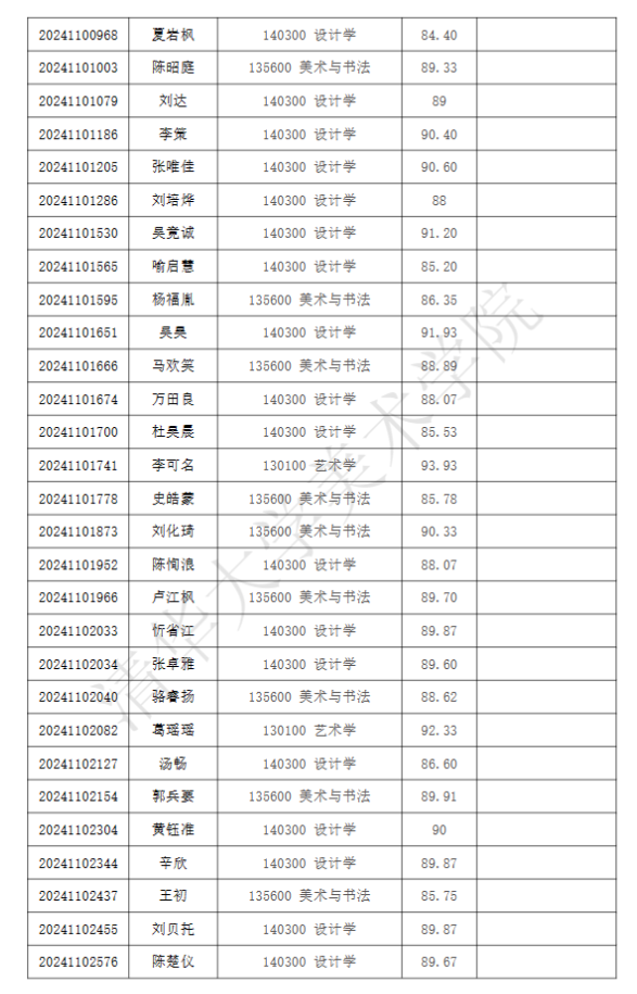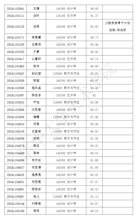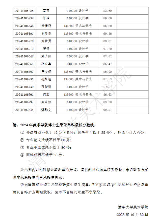 清華大學(xué)美術(shù)學(xué)院2024年博士研究生錄取名單 發(fā)布時(shí)間:2023-10-30 上一篇:清華大學(xué)美術(shù)學(xué)院碩士研究生2024年保研錄取名單 下一篇:清華大學(xué)2024年考研復(fù)試分?jǐn)?shù)線發(fā)布(學(xué)校線)