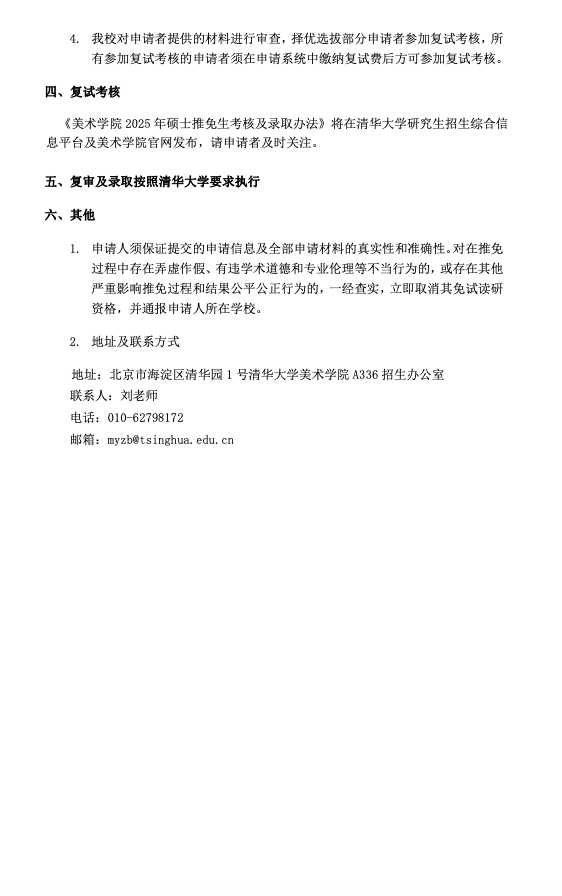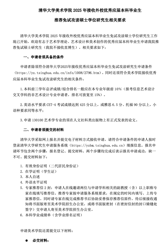 清華大學(xué)美術(shù)學(xué)院2025年推免生(保送生)招生通告 發(fā)布時(shí)間:2024-07-08 上一篇:清華大學(xué)美術(shù)學(xué)院2024年考研真題分享:621藝術(shù)理論基礎(chǔ) 下一篇:清華大學(xué)美術(shù)學(xué)院2025年招考博士(含碩博連讀 生)研究生綜合考核名單公示