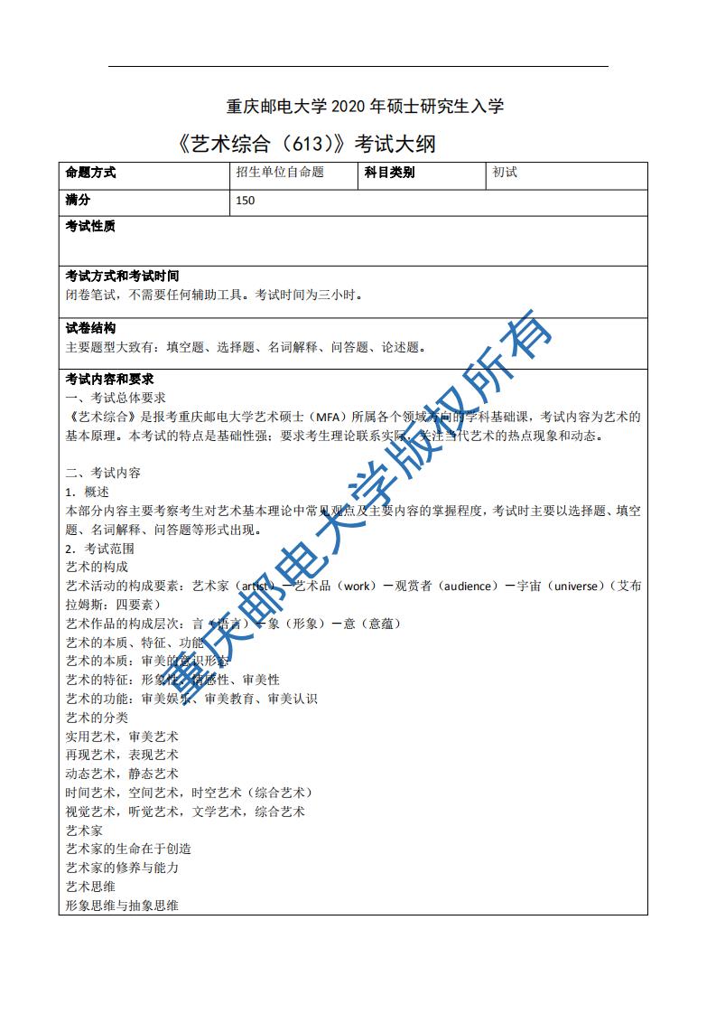 重慶郵電大學(xué)2020年考研考試大綱—613藝術(shù)綜合 發(fā)布時間:2019-09-01 重慶郵電大學(xué)2020年考研考試大綱—613藝術(shù)綜合 上一篇:重慶郵電大學(xué)傳媒藝術(shù)學(xué)院2020年考研招生目錄及參考書目 下一篇:重慶郵電大學(xué)2020年考研考試大綱—821藝術(shù)設(shè)計(jì)理論