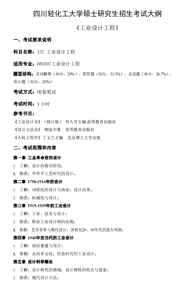 四川輕化工大學(xué)機(jī)械工程學(xué)院2025年工業(yè)設(shè)計(jì)工程考研參考書(shū)目及考試大綱:337工業(yè)設(shè)計(jì)工程