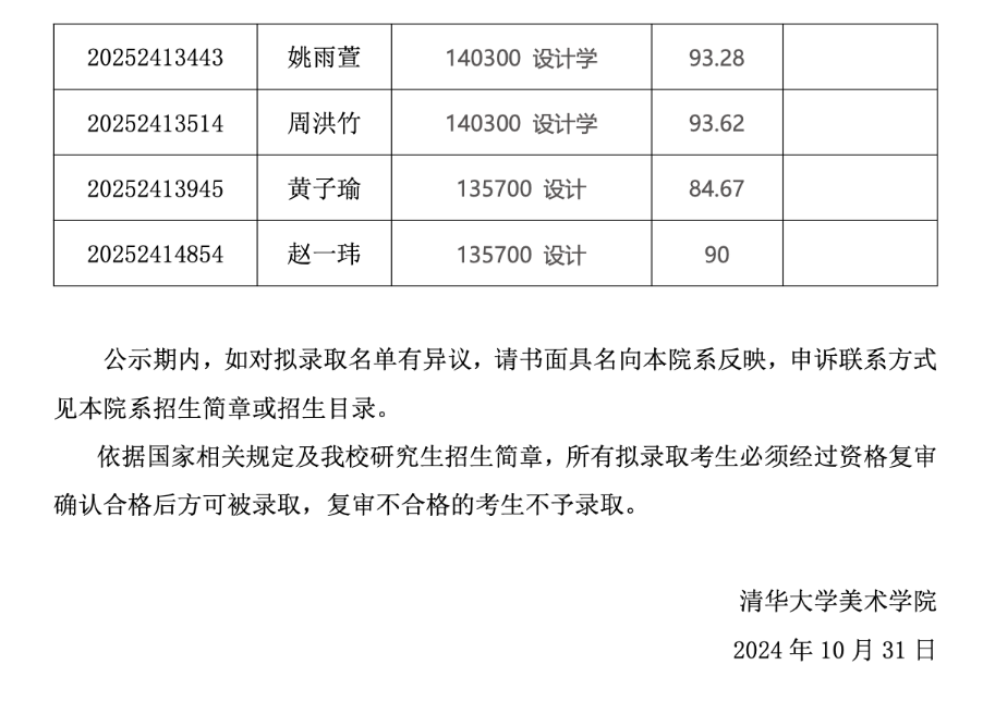 清華大學(xué)美術(shù)學(xué)院2025年保研錄取名單 發(fā)布時間:2024-10-31 上一篇:清華大學(xué)美術(shù)學(xué)院2025年非全日制藝術(shù)碩士項(xiàng)目簡介 下一篇:清華大學(xué)美術(shù)學(xué)院2025年公開招考博士研究生擬錄取名單公示